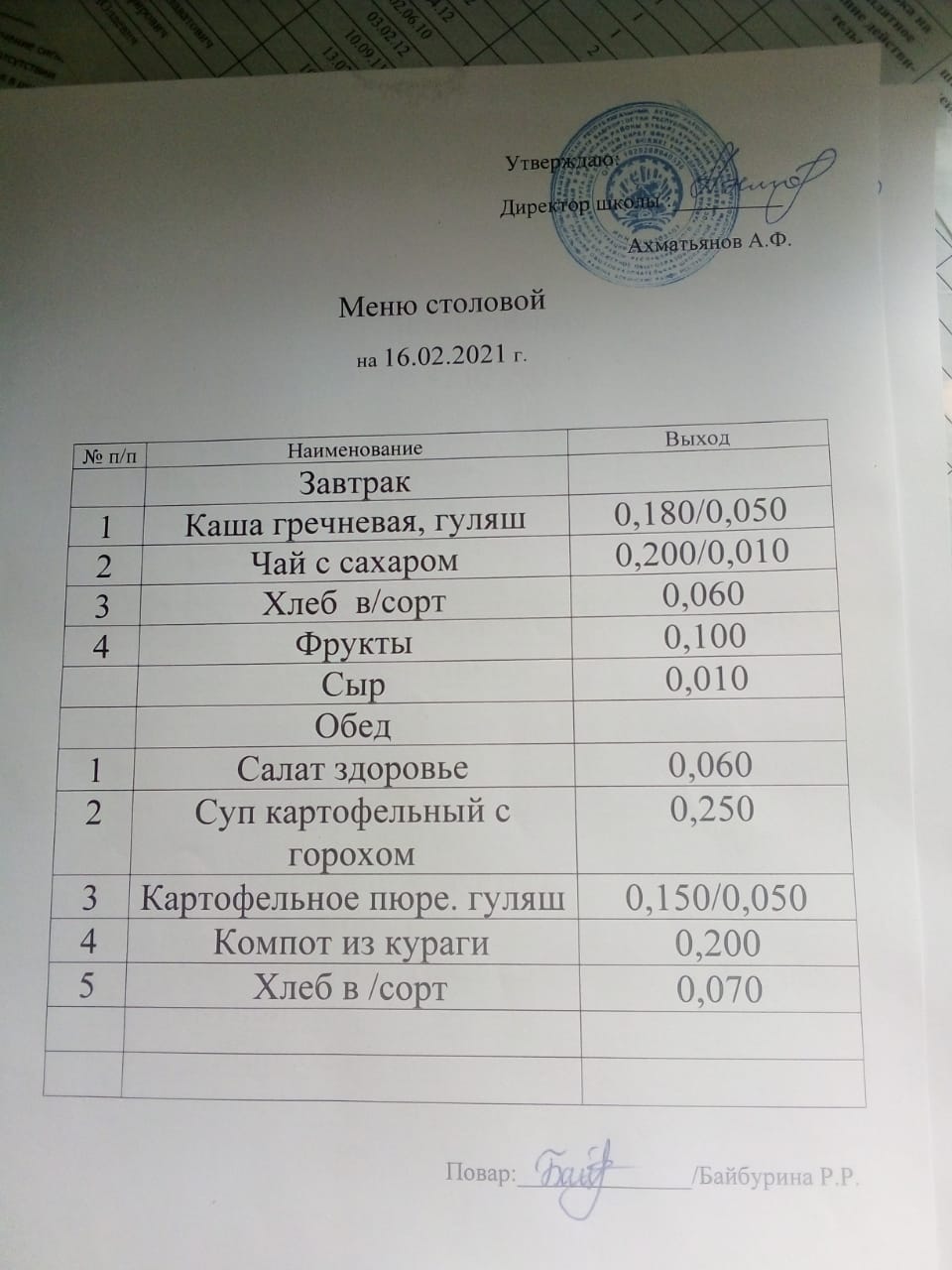 Меню столовой