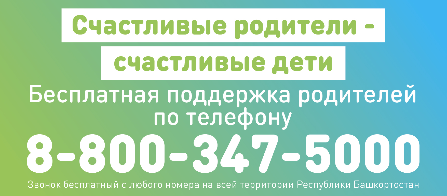 В Республике Башкортостан с 20 марта 2018 года функционирует служба психологической поддержки родителей по телефону, созданная в рамках реализации мероприятий, посвященных Году семьи в Республике Башкортостан. Звонки на телефонный номер 8-800-347-5000 доступны со всей территории республики, звонок бесплатный. Психологи линии консультируют по вопросам детско-родительских отношений, межличностных и семейных конфликтов, особенностей воспитания, развития и адаптации детей, в том числе к образовательным организациям (к детскому саду и к школе). Каждый абонент имеет возможность получить справочную информацию о работе службы семьи и записаться на очную консультацию к специалистам. С целью информирования родителей о работе бесплатной психологической поддержки родителей по телефону прошу разместить баннер на официальных сайтах учреждений, функционирующих на территории района/города и информационных стендах в образовательных организациях.